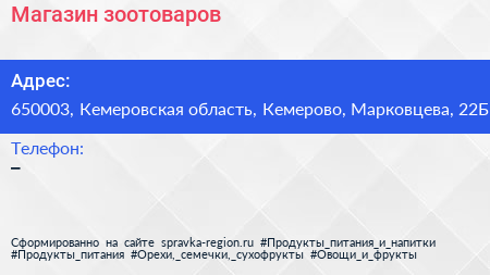 Магазин зоотоваров по адресу 650003, Кемеровская область, Кемерово, Марковцева, 22Б в дальнейшем Организация, размещена в следующих категориях: