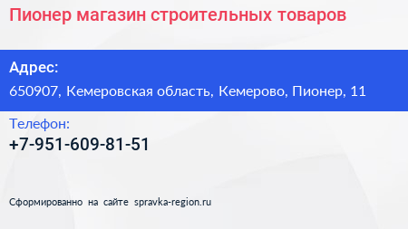 Пионер, магазин строительных товаров по адресу 650907, Кемеровская область, Кемерово, Пионер, 11 в дальнейшем Организация, размещена в следующих категориях: