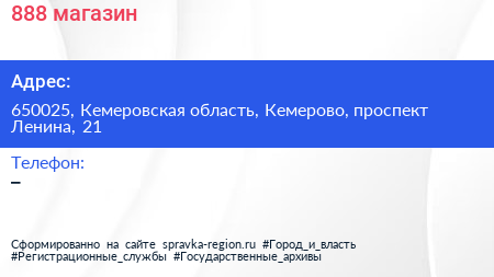 888, магазин по адресу 650025, Кемеровская область, Кемерово, проспект Ленина, 21 в дальнейшем Организация, размещена в следующих категориях: