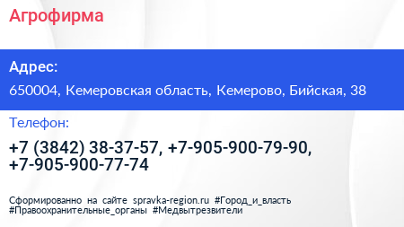 Агрофирма по адресу 650004, Кемеровская область, Кемерово, Бийская, 38 в дальнейшем Организация, размещена в следующих категориях: