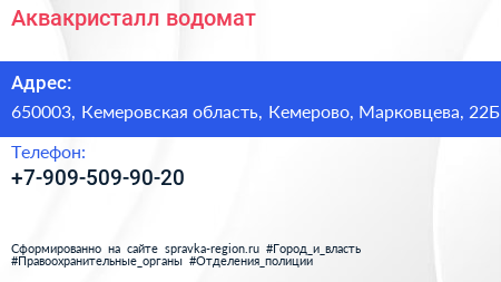 Аквакристалл, водомат по адресу 650003, Кемеровская область, Кемерово, Марковцева, 22Б в дальнейшем Организация, размещена в следующих категориях: