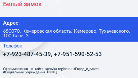 Белый замок по адресу 650070, Кемеровская область, Кемерово, Тухачевского, 100 блок 3 в дальнейшем Организация, размещена в следующих категориях: