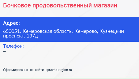 Бочковое, продовольственный магазин по адресу 650051, Кемеровская область, Кемерово, Кузнецкий проспект, 137д в дальнейшем Организация, размещена в следующих категориях: