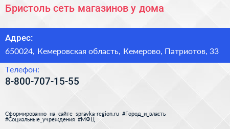 Бристоль, сеть магазинов у дома по адресу 650024, Кемеровская область, Кемерово, Патриотов, 33 в дальнейшем Организация, размещена в следующих категориях: