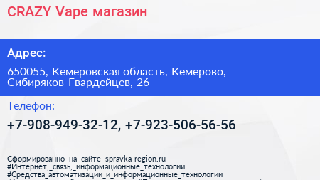 CRAZY Vape, магазин по адресу 650055, Кемеровская область, Кемерово, Сибиряков-Гвардейцев, 26 в дальнейшем Организация, размещена в следующих категориях: