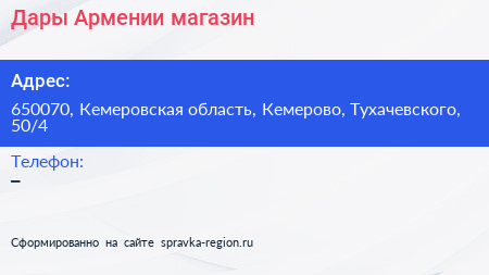 Дары Армении, магазин по адресу 650070, Кемеровская область, Кемерово, Тухачевского, 50/4 в дальнейшем Организация, размещена в следующих категориях: