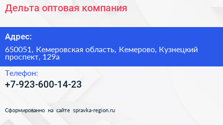 Дельта, оптовая компания по адресу 650051, Кемеровская область, Кемерово, Кузнецкий проспект, 129а в дальнейшем Организация, размещена в следующих категориях: