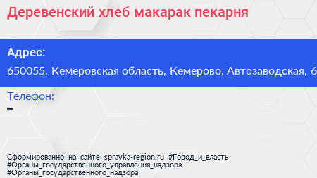 Деревенский хлеб макарак, пекарня по адресу 650055, Кемеровская область, Кемерово, Автозаводская, 6 в дальнейшем Организация, размещена в следующих категориях: