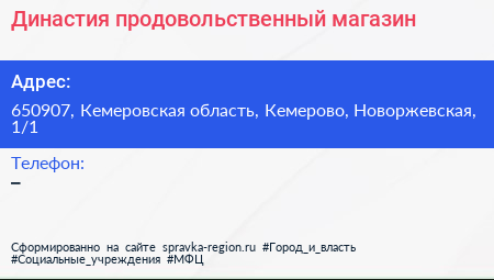 Династия, продовольственный магазин по адресу 650907, Кемеровская область, Кемерово, Новоржевская, 1/1 в дальнейшем Организация, размещена в следующих категориях: