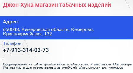 Джон Хука, магазин табачных изделий по адресу 650043, Кемеровская область, Кемерово, Красноармейская, 132 в дальнейшем Организация, размещена в следующих категориях: