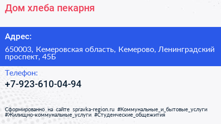 Дом хлеба, пекарня по адресу 650003, Кемеровская область, Кемерово, Ленинградский проспект, 45Б в дальнейшем Организация, размещена в следующих категориях: