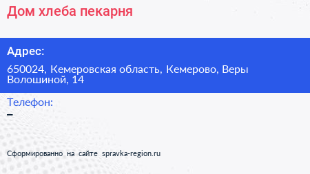 Дом хлеба, пекарня по адресу 650024, Кемеровская область, Кемерово, Веры Волошиной, 14 в дальнейшем Организация, размещена в следующих категориях: