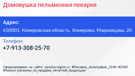 Домовушка, пельменная-пекарня по адресу 650003, Кемеровская область, Кемерово, Марковцева, 20 в дальнейшем Организация, размещена в следующих категориях: