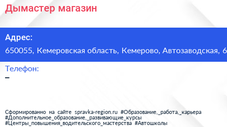 Дымастер, магазин по адресу 650055, Кемеровская область, Кемерово, Автозаводская, 6 в дальнейшем Организация, размещена в следующих категориях: