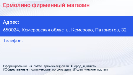 Ермолино, фирменный магазин по адресу 650024, Кемеровская область, Кемерово, Патриотов, 32 в дальнейшем Организация, размещена в следующих категориях:
