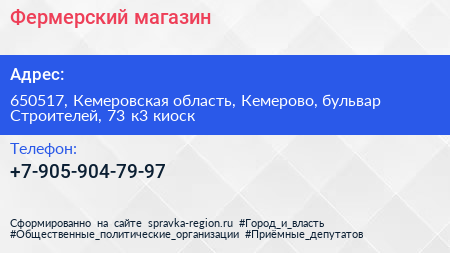 Фермерский магазин по адресу 650517, Кемеровская область, Кемерово, бульвар Строителей, 73 к3 киоск в дальнейшем Организация, размещена в следующих категориях: