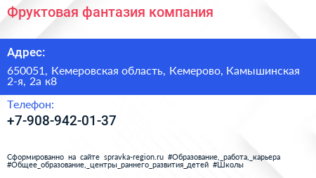 Фруктовая фантазия, компания по адресу 650051, Кемеровская область, Кемерово, Камышинская 2-я, 2а к8 в дальнейшем Организация, размещена в следующих категориях: