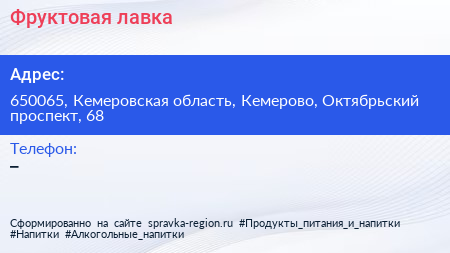 Фруктовая лавка по адресу 650065, Кемеровская область, Кемерово, Октябрьский проспект, 68 в дальнейшем Организация, размещена в следующих категориях: