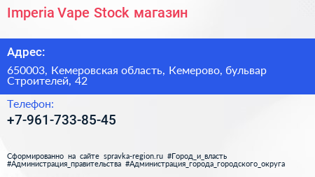 Imperia Vape Stock, магазин по адресу 650003, Кемеровская область, Кемерово, бульвар Строителей, 42 в дальнейшем Организация, размещена в следующих категориях: