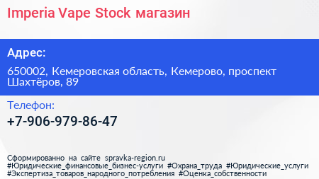 Imperia Vape Stock, магазин по адресу 650002, Кемеровская область, Кемерово, проспект Шахтёров, 89 в дальнейшем Организация, размещена в следующих категориях: