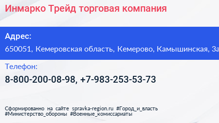 Инмарко-Трейд, торговая компания по адресу 650051, Кемеровская область, Кемерово, Камышинская, 3а в дальнейшем Организация, размещена в следующих категориях: