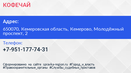 КОФЕЧАЙ по адресу 650070, Кемеровская область, Кемерово, Молодёжный проспект, 2 в дальнейшем Организация, размещена в следующих категориях: