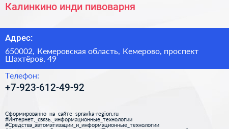 Калинкино, инди-пивоварня по адресу 650002, Кемеровская область, Кемерово, проспект Шахтёров, 49 в дальнейшем Организация, размещена в следующих категориях: