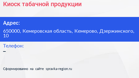 Киоск табачной продукции по адресу 650000, Кемеровская область, Кемерово, Дзержинского, 10 в дальнейшем Организация, размещена в следующих категориях: