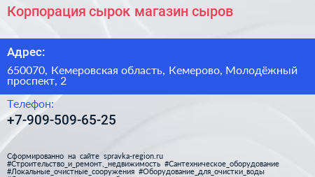 Корпорация сырок, магазин сыров по адресу 650070, Кемеровская область, Кемерово, Молодёжный проспект, 2 в дальнейшем Организация, размещена в следующих категориях: