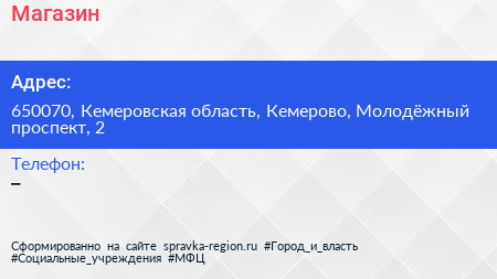 Магазин по адресу 650070, Кемеровская область, Кемерово, Молодёжный проспект, 2 в дальнейшем Организация, размещена в следующих категориях: