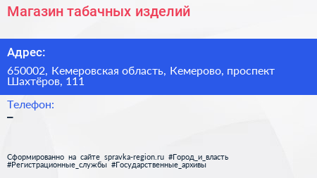 Магазин табачных изделий по адресу 650002, Кемеровская область, Кемерово, проспект Шахтёров, 111 в дальнейшем Организация, размещена в следующих категориях: