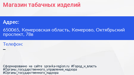 Магазин табачных изделий по адресу 650065, Кемеровская область, Кемерово, Октябрьский проспект, 78в в дальнейшем Организация, размещена в следующих категориях: