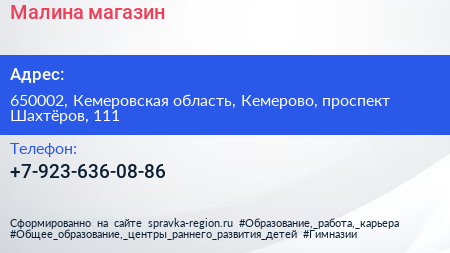 Малина, магазин по адресу 650002, Кемеровская область, Кемерово, проспект Шахтёров, 111 в дальнейшем Организация, размещена в следующих категориях: