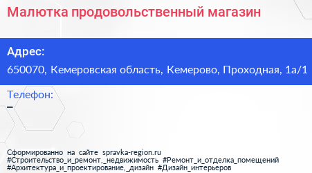 Малютка, продовольственный магазин по адресу 650070, Кемеровская область, Кемерово, Проходная, 1а/1 в дальнейшем Организация, размещена в следующих категориях: