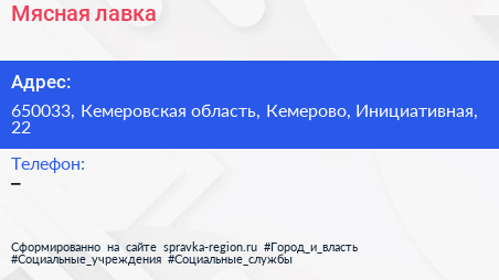 Мясная лавка по адресу 650033, Кемеровская область, Кемерово, Инициативная, 22 в дальнейшем Организация, размещена в следующих категориях: