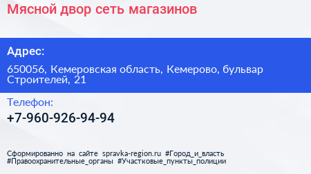 Мясной двор, сеть магазинов по адресу 650056, Кемеровская область, Кемерово, бульвар Строителей, 21 в дальнейшем Организация, размещена в следующих категориях: