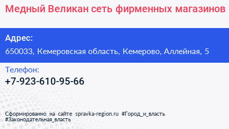 Медный Великан, сеть фирменных магазинов по адресу 650033, Кемеровская область, Кемерово, Аллейная, 5 в дальнейшем Организация, размещена в следующих категориях: