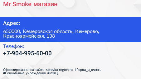 Mr.Smoke, магазин по адресу 650000, Кемеровская область, Кемерово, Красноармейская, 138 в дальнейшем Организация, размещена в следующих категориях: