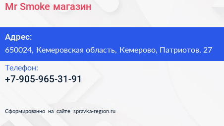Mr.Smoke, магазин по адресу 650024, Кемеровская область, Кемерово, Патриотов, 27 в дальнейшем Организация, размещена в следующих категориях: