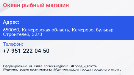 Океан, рыбный магазин по адресу 650060, Кемеровская область, Кемерово, бульвар Строителей, 32/3 в дальнейшем Организация, размещена в следующих категориях: