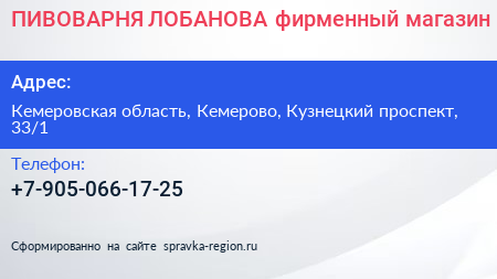 ПИВОВАРНЯ ЛОБАНОВА, фирменный магазин по адресу Кемеровская область, Кемерово, Кузнецкий проспект, 33/1 в дальнейшем Организация, размещена в следующих категориях: