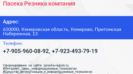 Пасека Резника, компания по адресу 650000, Кемеровская область, Кемерово, Притомская Набережная, 13 в дальнейшем Организация, размещена в следующих категориях: