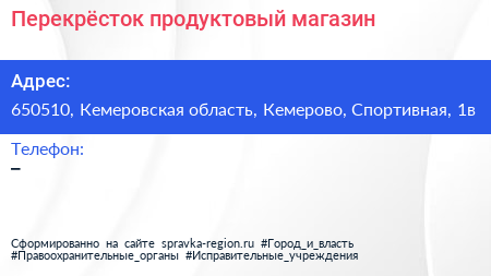 Перекрёсток, продуктовый магазин по адресу 650510, Кемеровская область, Кемерово, Спортивная, 1в в дальнейшем Организация, размещена в следующих категориях: