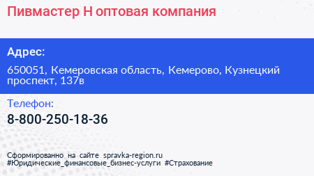 Пивмастер-Н, оптовая компания по адресу 650051, Кемеровская область, Кемерово, Кузнецкий проспект, 137в в дальнейшем Организация, размещена в следующих категориях: