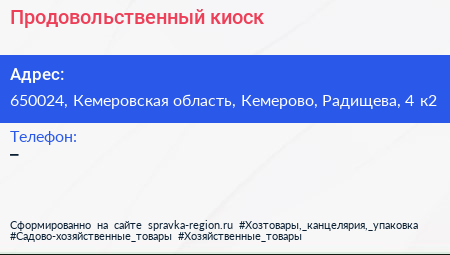 Продовольственный киоск по адресу 650024, Кемеровская область, Кемерово, Радищева, 4 к2 в дальнейшем Организация, размещена в следующих категориях:
