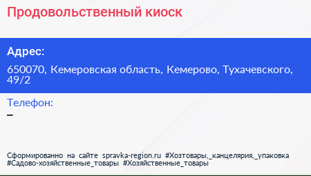 Продовольственный киоск по адресу 650070, Кемеровская область, Кемерово, Тухачевского, 49/2 в дальнейшем Организация, размещена в следующих категориях: