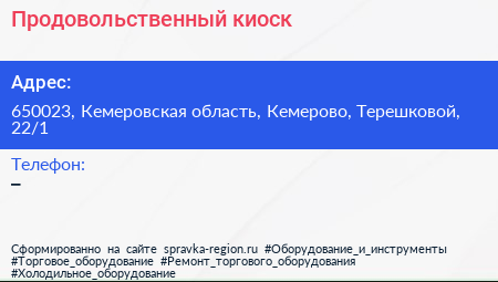 Продовольственный киоск по адресу 650023, Кемеровская область, Кемерово, Терешковой, 22/1 в дальнейшем Организация, размещена в следующих категориях: