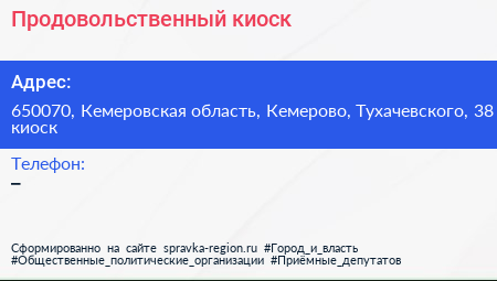 Продовольственный киоск по адресу 650070, Кемеровская область, Кемерово, Тухачевского, 38 киоск в дальнейшем Организация, размещена в следующих категориях: