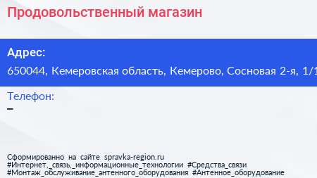 Продовольственный магазин по адресу 650044, Кемеровская область, Кемерово, Сосновая 2-я, 1/1 в дальнейшем Организация, размещена в следующих категориях: