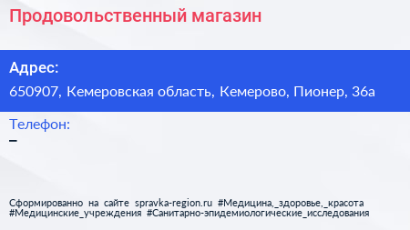 Продовольственный магазин по адресу 650907, Кемеровская область, Кемерово, Пионер, 36а в дальнейшем Организация, размещена в следующих категориях: